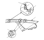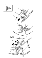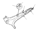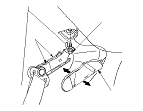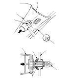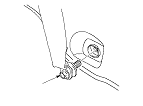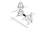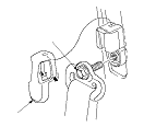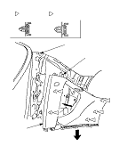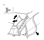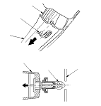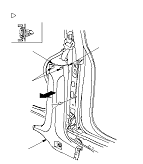 The upper clip in the front pillar trim (A) consists of a grommet (B) and a pin (C). The grommet expanded with the pin secures it to the body panel (D). The projections (E) on the pin is broken during removal, so the clip must be replaced with a new one when the trim is reinstalled.